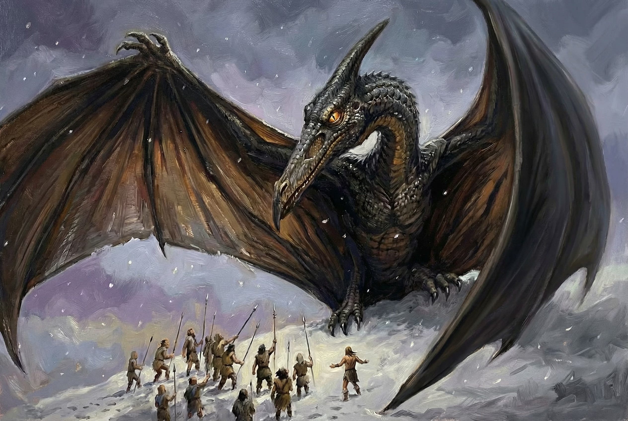Thorgun had seen them circling the peaks, black shapes against grey sky, too distant to seem real. The elders spoke of them as one might speak of demons. Beings from the time before time, when the world was young and fire still ran freely through stone. They were never hunted. They were avoided, occasionally placated with offerings left at the treeline, and in desperation even prayed to when storms came down from the heights.